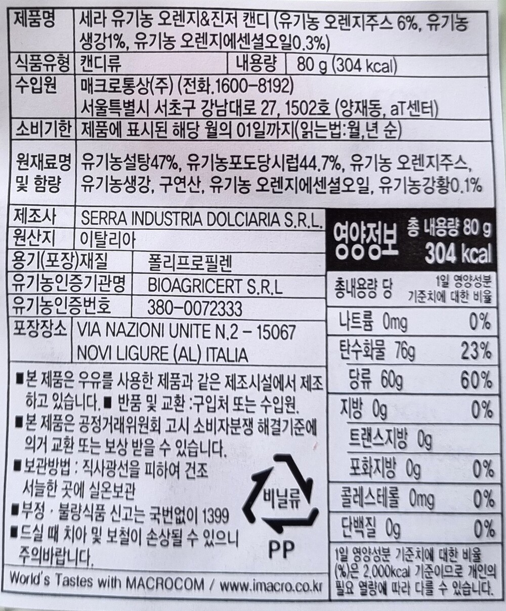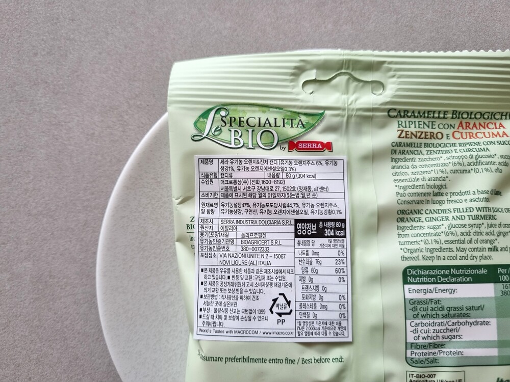생강을 간편하게 즐길 수 있는 건강한 원료로 만든 캔디를 찾다가 이탈리아 세라(Serra) 유기농, 슈가프리 캔디를 열한번째 달에 담아오게 되었습니다. 손바닥 크기의 봉투에 개별포장된 캔디 80g이 담겨있고 인위적이지 않은 달콤함 끝에 생강의 맛이 은은하게 나서 부담없이 즐기실 수 있을 거라 생각합니다.