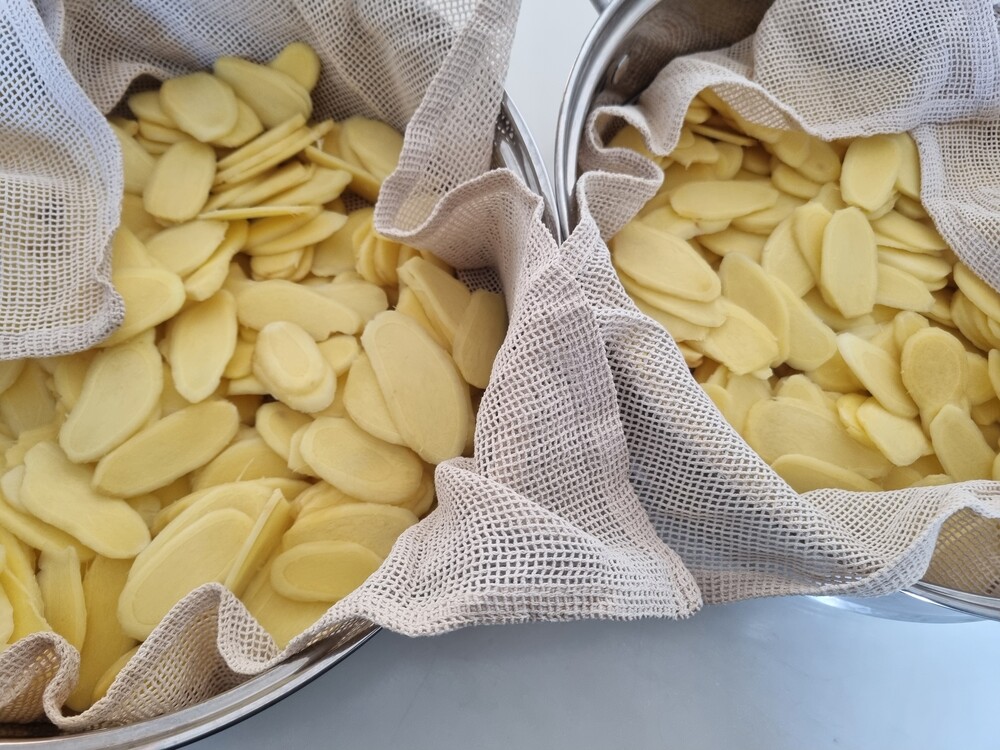 02. 텀블러에 뜨거운 물 약 200ml, 생강칩 4~5편을 넣고 5분 이상 우려주세요. 구수하고 깔끔한 처음의 맛에서 조금 더 우려내면 생강의 알싸한 맛을 느끼실 수 있습니다. 레몬칩과 함께 우려서 드셔도 좋습니다.