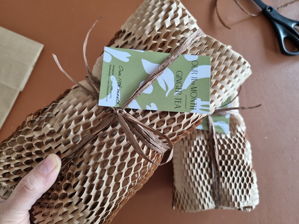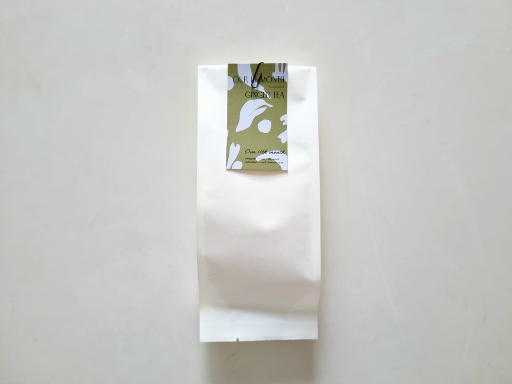 02. 친환경 종이 포장재 : 친환경 소재의 종이 포장재에 쪄서 말리고 덖은 생강차 40g을 담았습니다.