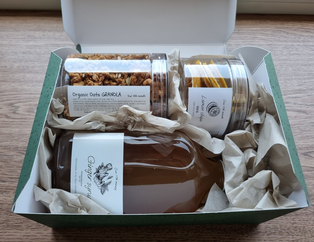 그래놀라 200g, 생강시럽 340ml, 레몬칩 20g으로 구성된 기프트 세트 37,500원(그래놀라 13,500+생강시럽19,500+레몬칩4,500)